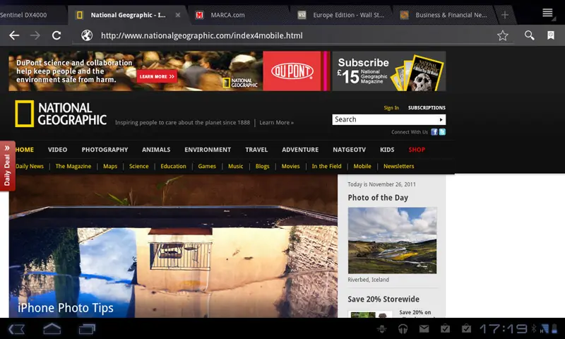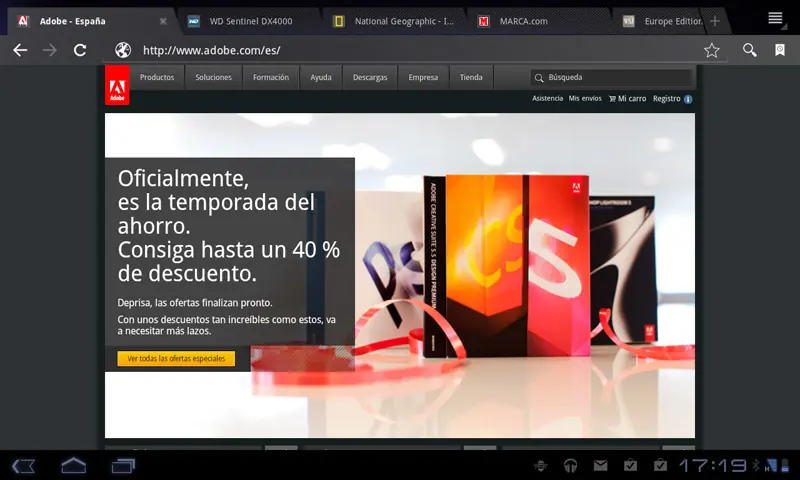 Navegación web. Al Optimus Pad se le da bien esto de navegar por Internet. Ayuda la pantalla en formato más panorámico, la agilidad con la que manejaremos ampliar zonas de la pantalla, al deslizarnos por el contenido con suavidad, y la rapidez con la que se carga el website a través de la conectividad 3G, esto último gracias al procesador 1Ghz de doble núcleo de Nvidia.