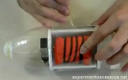 Cuando el sistema ya esté preparado lo único que debemos hacer es colocar la botella con el corcho hacia abajo y sostenerla en esa posición con algo, nunca con la mano. Luego podemos comenzar el experimento introduciendo aire con el inflador hacia dentro de la botella. Cuanto más rápido lo hagamos más veloz será nuestro cohete.