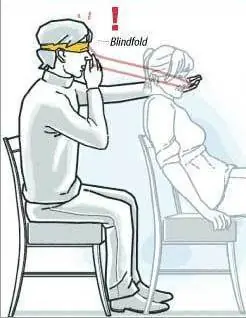 Esto puede realizarse con tres personas, una que es sujeto y otros dos observadores y también necesitamos un auricular, y unos tubos de plastico, el auricular debe estar en alguno de los 2 lados del tubo. Pedir a alguien que se siente en una silla entre usted y el segundo observador. Ahora cada uno de ustedes tienen los tubos de los auriculares en los lados correspondientes y uno a uno hable en las tuberías. El primero de los observadores le dira en que direccion esta saliendo su sonido. Ahora viene el intercambio de las tuberías y repetir el procedimieno, el observador debe producir el sonido y debe decir en que direccion. El cerebro interpreta el sonido de otra menera por lo que se confunde y va en la dirección opuesta del sonido.