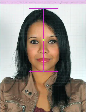 Medida de la cara/cabeza (Biométrico). Haga clic en el círculo amarillo y arrastre la regla aproximadamente al centro de su cara (en su foto). Use los círculos azules ubicados a los extremos para medir su cara/cabeza propiamente. Asegúrese de cubrir toda su cabeza desde el punto más alto de su cabello hasta el punto más bajo de su quijada. (mire la foto en la sección de dimensión).