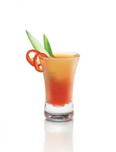 A un vaso de “shot” de 2 oz. ponerle sal en la orilla. En un agitador, mezcle el jugo de limón, tequila, polvo de cebolla y salsa de Chile calientes. Vierta la mezcla en el vaso y decorar el borde con un anillo de jalapeño. Después de tomar el shot exprima el limón en su boca.
