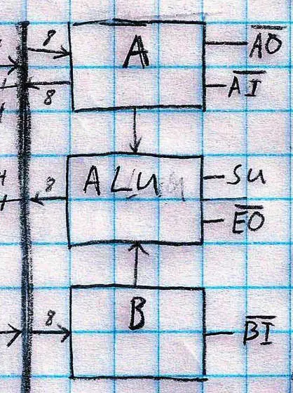 Registros: Los registros podrían ser la parte más importante de un ordenador. Un registro almacena temporalmente un valor durante el funcionamiento de un ordenador. El ordenador de 8-bits se describe en este Instructable tiene dos registros unidos a sus ALU, un registro para almacenar la instrucción actual y un registro para la salida de la computadora. Dependiendo del chip, un registro tendrá 2 o 3 clavijas de control. Los registros que se va a utilizar tienen dos pines de control: habilitar la salida y entrada de habilitación (tanto activa como cuando se baja). Cuando la salida de habilitar pasador se conecta a tierra la palabra binaria almacenada en la actualidad se envía a través de los pines de salida. Cuando el pasador de entrada se conecta a tierra el presente palabra binaria en los pines de entrada se carga en el registro. Un ejemplo del uso de un registro en un equipo es el acumulador en la ALU (unidad aritmética lógica que realiza operaciones matemáticas). El acumulador es como el bloc de notas para la computadora que almacena la salida de la ALU. El acumulador es también la primera entrada para la ALU. El registro B es la segunda entrada. Para una operación de adición, el primer valor es cargado en el acumulador. Después de que el segundo valor que se añade al primer valor es cargado en el registro B. Las salidas del acumulador y el registro B se funden abierto y están constantemente en la alimentación de la ALU. El paso final para la adición es transferir la salida de la operación en el acumulador.