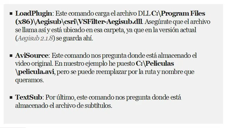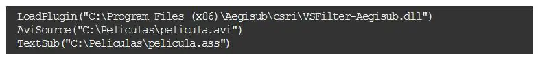 dijo:Este programa, realmente es un sistema que funciona mediante scripts. No te preocupes, para lo que queremos sólo necesitamos crear un archivo (guardado junto al vídeo y los subtítulos, con el mismo nombre, pero extensión .avs) con los siguientes datos:[/quote]