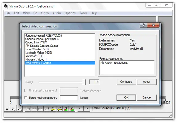 Así pues, marcamos el menú Video / Full processing mode. Para la recodificación necesitaremos indicar un codec de vídeo, por lo que nos movemos a Video / Compression y seleccionamos uno adecuado. Mi preferido es XviD MPEG-4 Codec, si no te aparece en la lista, puedes instalarlo aquí:
