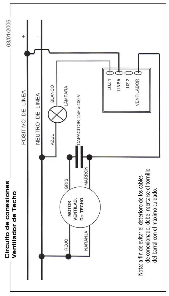 Lea TODAS las instrucciones y la información sobre seguridad hasta el final. Para reducir el riesgo de incendio o de descarga eléctrica, nunca utilice el ventilador con dispositivos de control de velocidad de estado sólido ni con interruptores de velocidad variable, a menos que estén específicamente diseñados para ventiladores de cielo raso. No fije el ventilador a una caja eléctrica de plástico, sino a una caja metálica firmemente sujeta a la estructura del edificio.