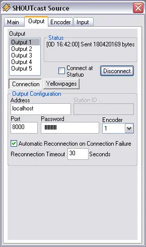 En esta misma ventana, selecciona la pestaña "Output" y añade la contraseña por defecto del servidor (si no la has cambiado es "changeme". Asegúrate que el puerto es el correcto (8000) y el campo Address es "localhost", si quieres emitir desde el mismo ordenador donde tienes instalado el servidor.