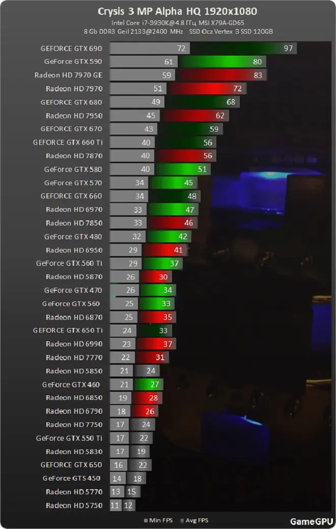 Para este analisis usaron un equipo basado en el microprocesador Intel Core i7-3930K overclockeado a 4.8GHz, equipado con 8GB de memoria Geil DDR3-2133 overclockeada a 2400MHz, y acompañado de un total de 35 tarjetas de video basadas en GPUs de Nvidia y AMD de diversas generaciones gráficas. Sin mayor preámbulo, aquí algunos de sus test: