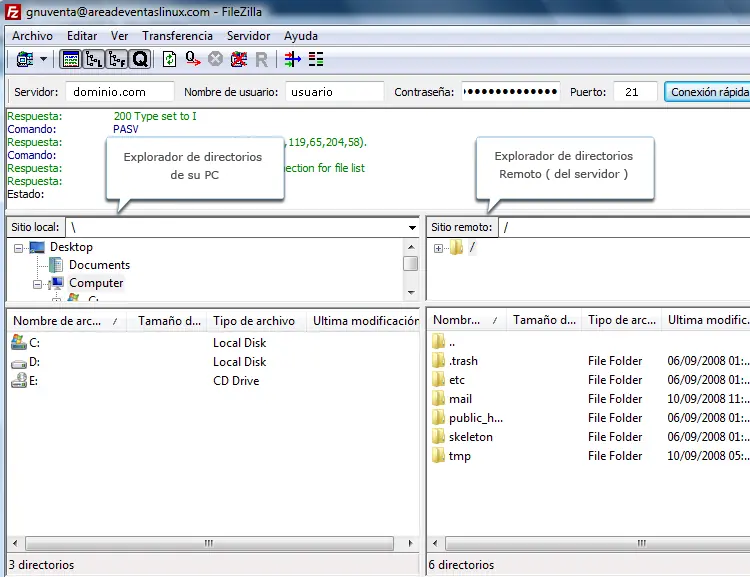 Aguarda que se realice la conexión al servidor. Si es correcta podras ver en el explorador del lado izquierdo las carpetas de tu servidor.