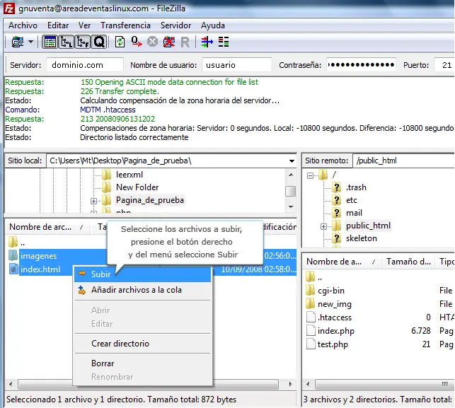 Paso 4: selecciona los archivos que deseas subir al servidor, presiona el botón derecho sobre los mismos y del menú que se despliega selecciona la opción Subir