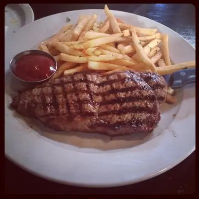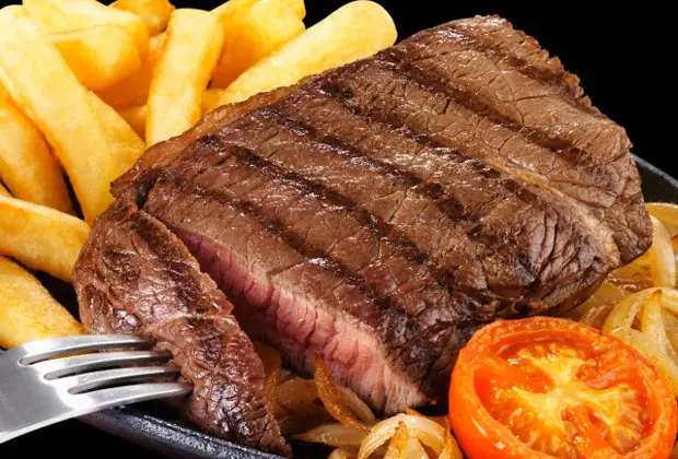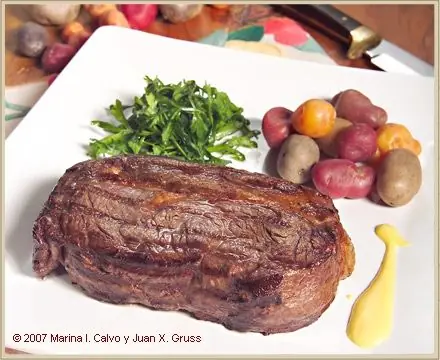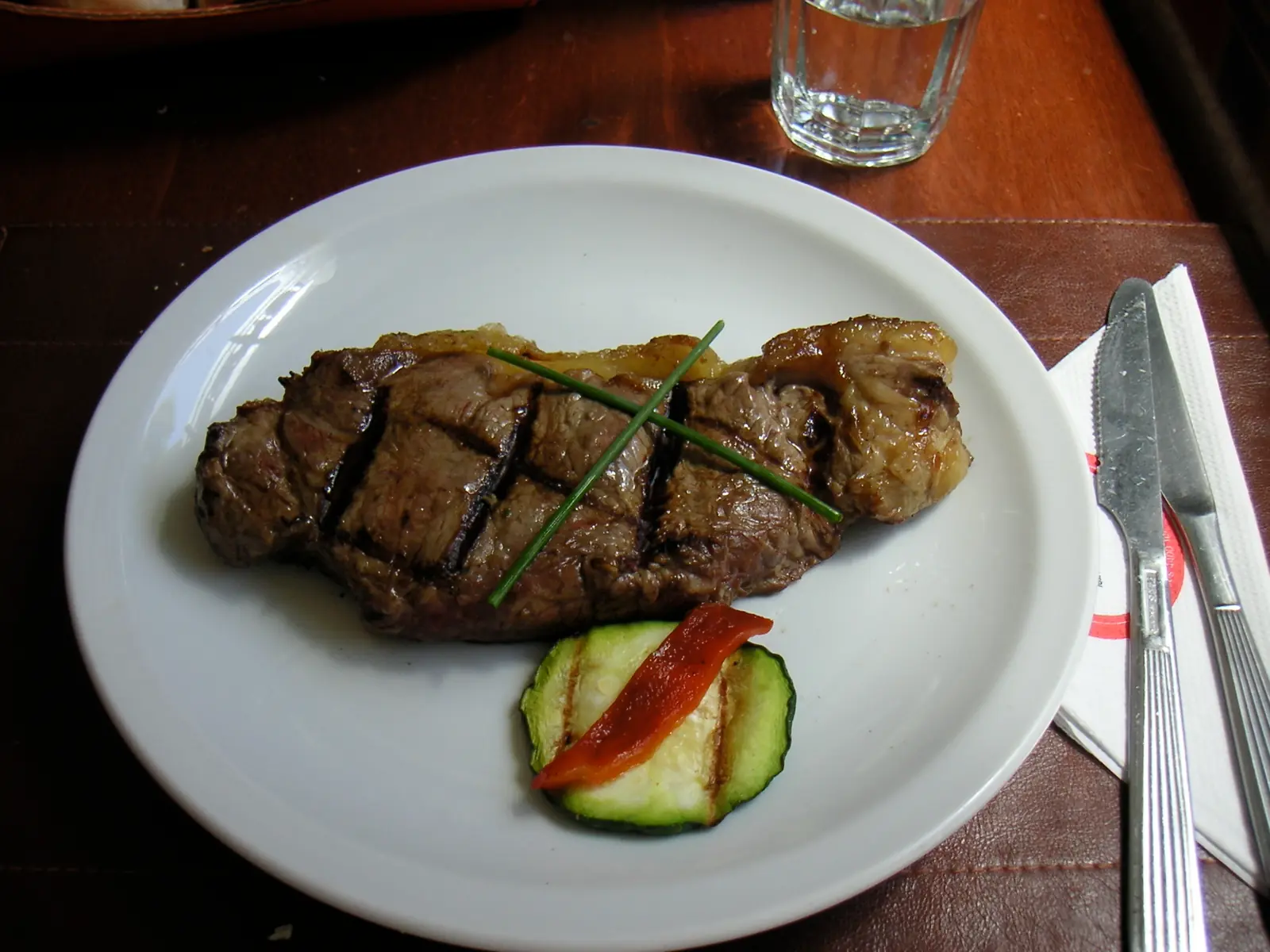 Bife de chorizo, 1 por persona, cortado de 3 cm. de ancho, si es más ancho ya requiere de una parrilla para ser cocinado.