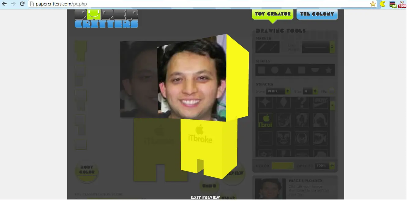 Paper Critters es una pagina donde puedes hacer tus propios diseños como este que hice de ejemplo, luego lo puedes imprimir y decorar tu escritorio o darle de regalo a una persona con una fotografia suya, pues la herramienta permite subir imágenes y tomarlas como la cara de tu diseño