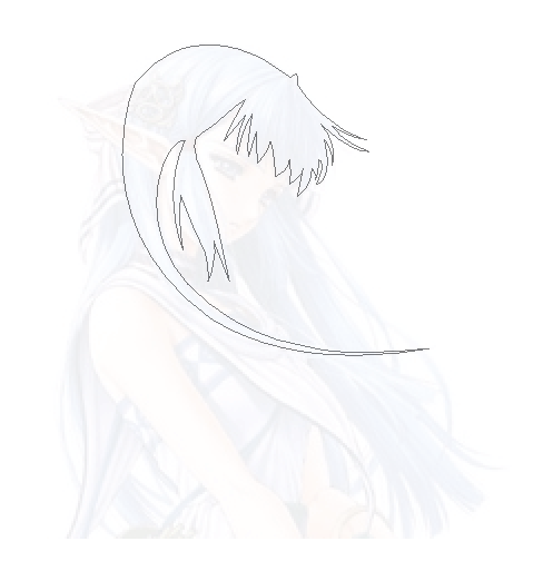 Y con la herramienta Pluma seleccionada, haga clic en un punto en algún lugar de la forma del cabello (en la cima), y haga clic para hacer otro punto en algún lugar de la línea del cabello, donde la línea se empiezan a formar. Puede mantener pulsado y "dirección" el ángulo de la línea para crear un cierto tipo de curva. Se toma un tiempo para conseguir la caída de, pero es muy fácil una vez que el cuelgue de ella. Después de graficar los puntos de una sección completa del pelo, el tuyo debe ser similar a esto: (Nota: He aligerado la opacidad de la niña para ilustrar lo que sus líneas debe ser similar hasta ahora)