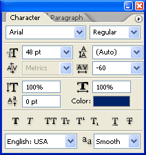 En la ventana del personaje a la derecha, ajuste de AV a -60 como se muestra a continuación: (Esto simplemente reduce el espacio entre cada carácter independiente, me gusta empezar con este ajuste, no sé por qué