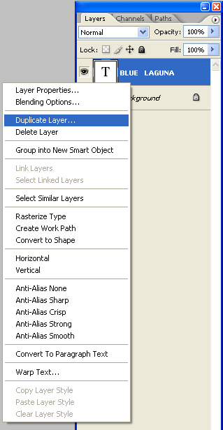 Una vez que te encuentras con un tipo de letra que parece que podría funcionar, debe Duplicarla capa en la ventana de capas a la derecha y, a continuación, ocultar la capa anterior (la capa que hace clic derecho y seleccione "Duplicar". De esta manera, usted he guardado la selección de fuente (la capa oculta), y tiene una nueva capa a encontrar más fuentes de) :