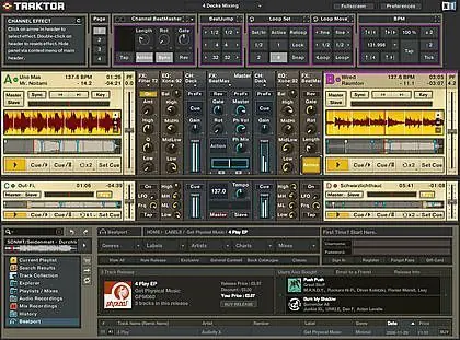 Traktor DJ Studio ofrece además una característica que no tienen sus competidores, acceso integrado a la tienda musical online de Beatport, de manera que podemos escuchar, comprar e importar directamente nuevas canciones.