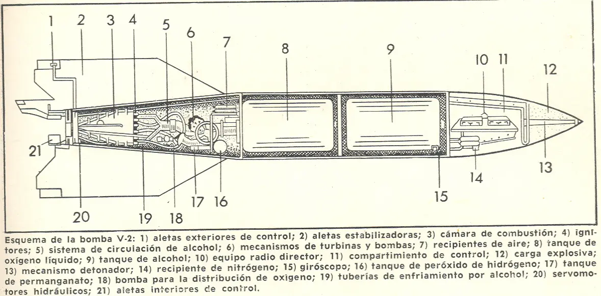 En la cabeza iban los 910 kgs, de amatol que constituían su carga explosiva; a continuación, entre la carga y los depósitos de combustible, venía un pequeño compartimiento en el que se situaban los mecanismos de control automático y de radio-dirección; seguían después los depósitos cilíndricos de combustible, las bombas que asPi/an los líquidos en la cámara de combustión finalmente ésta con su tobera del tipo «Laval» a la salida de la cual se encontraban, en medio del paso de los gases eyectados, unas pequeñas aletas de dirección construidas en grafito, que actuaban como estabilizadores del cohete.