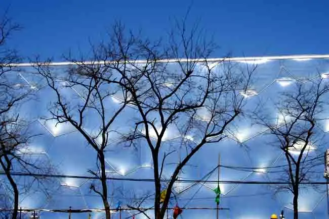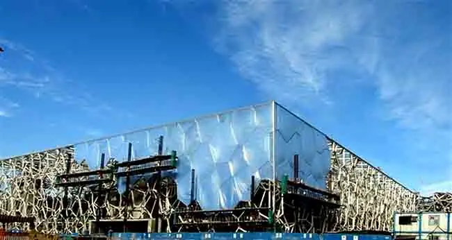 El casco de la estructura, diseñado con finalidades medioambientales, aprovecha los rayos solares para proveer calor y luz, lo que permite ahorrar un 30% de energía eléctrica, según el Comité de organización de los JO-2008 (BOCOG).