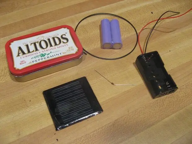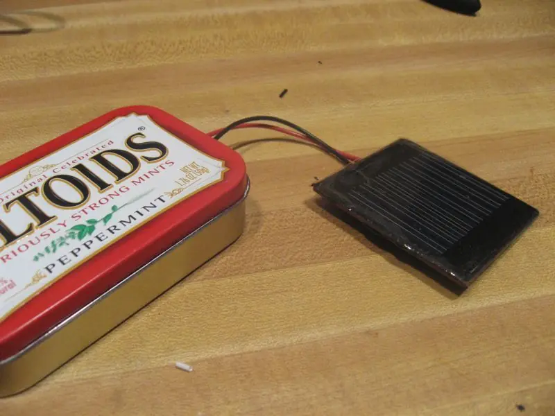 Si utilizamos dos AA recargables que ponen a cabo un total de 2.4Vs vamos a necesitar un panel solar de por lo menos 3 - 4Vs sólo para cumplir con los niveles básicos de la carga. Cuanto mayor sea el voltaje de la celda solar (o celdas), menos luz que necesitamos para cargar las baterías. . Ahora también estamos tratando de encajar esto en una lata Altoids, por lo que estamos limitados en el espacio He encontrado algunas células 4V grandes solares que se integran perfectamente en latas Altoids. Ellos son los mismos que uso con mi cargador solar AA Atoids . Claro, una célula solar más grande y mejor nos daría una mayor potencia, pero no encajaría en nuestro estaño. (Algo que me ha molestado con casi todos los Altoids Guía Solar por ahí.) También se puede utilizar una combinación de varias células más pequeñas para obtener los cuatro voltios. Por ejemplo, las células 2V son muy baratos y pequeños en eBay. Desde aquí se puede conectar dos de ellos en una serie para obtener su 4Vs. Sólo recuerde que cuando la carga de baterías NiMh no queremos tirar más del 10% de su capacidad a ellos en cualquier momento. Por ejemplo, si la batería tiene una capacidad de 2000 ma sólo podemos usar una célula solar que pone a 200 mA o menos de la corriente. Esto no suele ser un problema a menos que usted está utilizando una célula solar masiva o una combinación de células grandes. Sin embargo, tenga esto en mente.