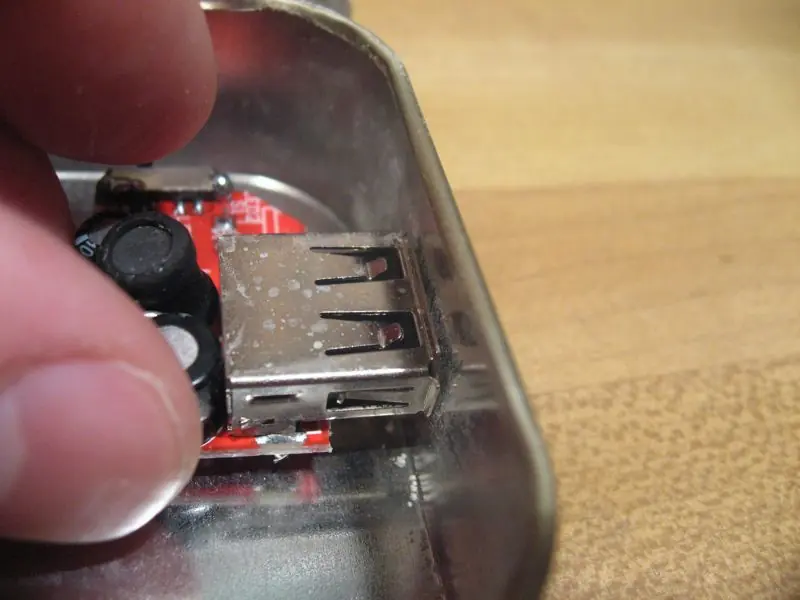 Yo uso latas Altoids, porque son el prefecto tamaño para este proyecto. Además, muy lindo. Sólo tiene que utilizar algunas tijeras de hojalatero para cortar un agujero lo suficientemente grande para el puerto USB. Si quiere ser de lujo también puede utilizar un Dremel y hacer un agujero rectángulo agradable en el lado de la lata.
