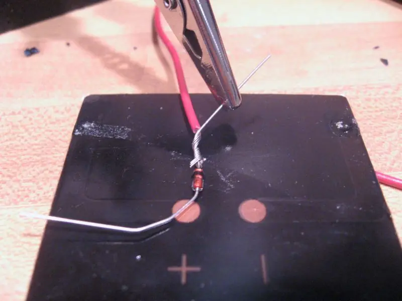 En primer lugar, vamos a cablear nuestro panel solar. Me gustaría conectar mi diodo 1N914 directamente al panel solar. Al soldar asegúrese de que la barra de color negro en el diodo 1N914 es el punto fuera de la celda solar. La barra de color negro es el lado negativo y evita el reflujo de energía. Si lo ponemos en mal vamos a evitar que la corriente que fluye en nuestro circuito! continuación, conecte los alambres largos tanto para el diodo y ficha negativo en su celda solar. Luego sujete con cinta adhesiva para su protección.