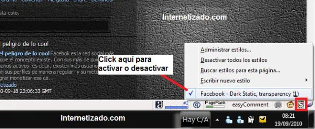 Simplemente haz click en la S que se muestra en la esquina inferior derecha de la ventana, dentro de la página de Facebook. Desde ahí puedes activar o desactivar un diseño.