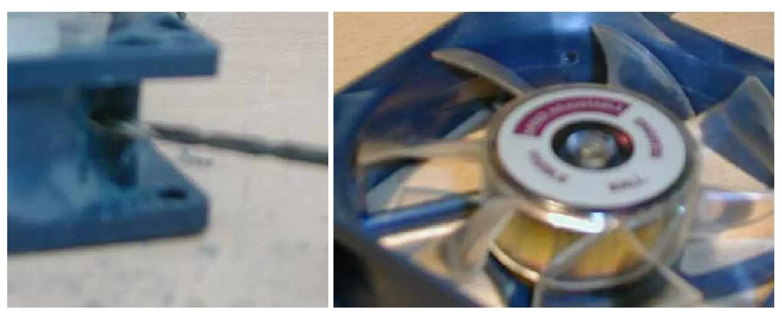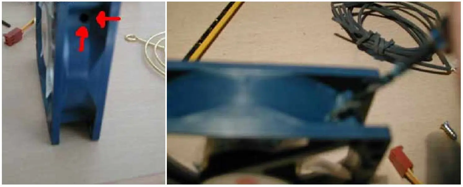 Una vez listos los LED´s vamos a hacer los agujeros en el ventilador con un micro taladro (o una dremel o similar) y una broca de 3mm, primero marcaremos el sitio donde vamos a perforar como se muestra en la imagen de la izquierda y luego muy despacio y con cuidado para no dañar las aspas y que el ventilador no se desequilibre haremos los 4 agujeros.