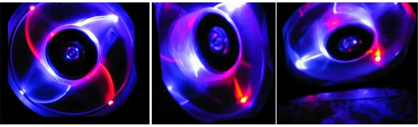 Para terminar les dejo una fotos del ventilador en funcionamiento para que vean que chulo queda el efecto, como comprobaras yo he elegido el color ROJO y AZUL que produce un efecto bastante "precioso" pero tambien un solo color puede quedar bien o otras comvinaciones como ROJO-VERDE o AZUL-VERDE, no lo dudes y ¡¡¡PROBA TU MISMO!!!