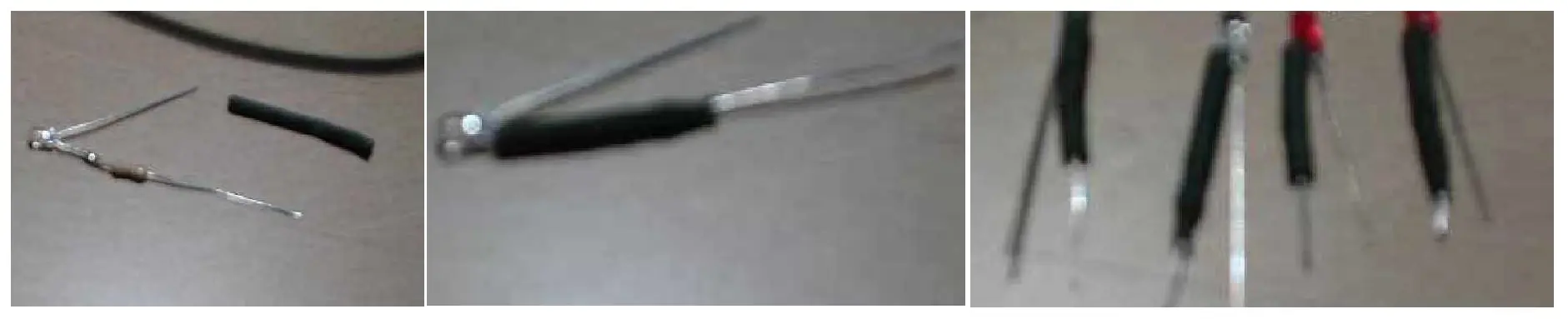 Bien ahora vamos a soldar el + del LED a la resistencia como se ve en la imagen de la derecha, esta operación debe realizarse con precaución puesto que si la temperatura se elevase demasiado podríamos romper el LED, una vez soldado enfundaremos la resistencia en un trocito de macarrón termoretractil como se ve en la imagen central, y así repetiremos la operación 3 veces mas hasta que tengamos listos todos los LED´s.
