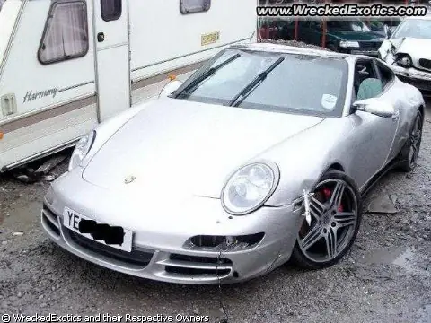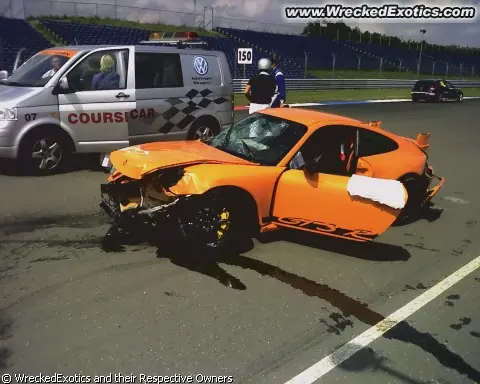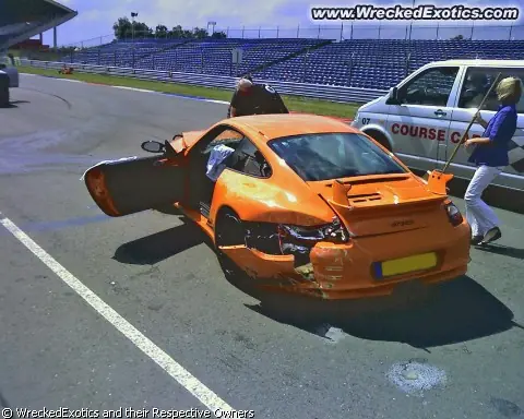 Encuentro de Porsche en el autodromo, menos de 2000 kilometros de uso. Trato de pasar un 911 viejito por la banquina (sisi, por el pasto, afuera de la pista) y entro de costado a la recta, le dio de trompa al paredon de boxes, reboto y le dio de cola... pobrecito