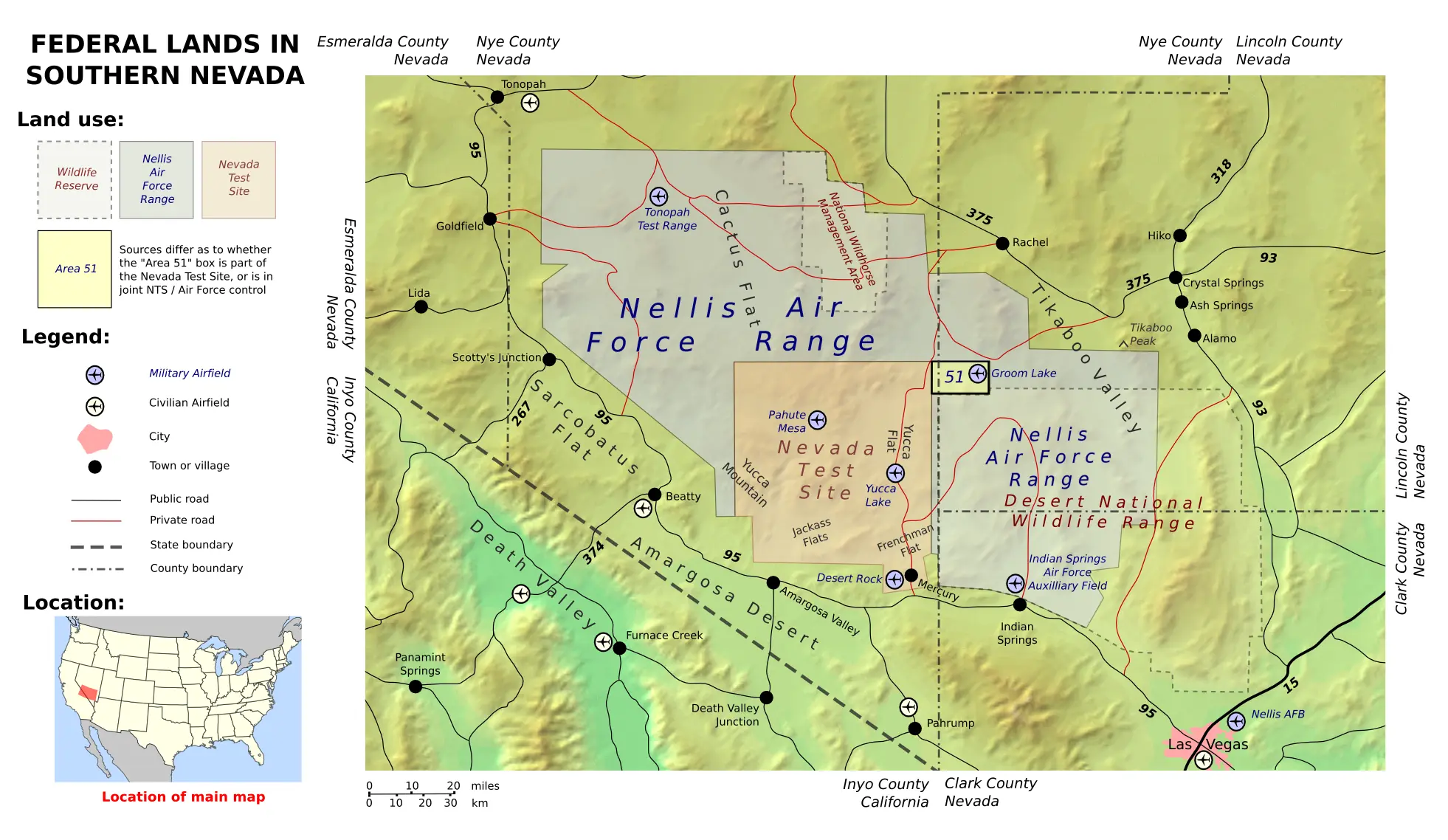 Vista de satélite del Área 51 (1968)El Área 51 es una sección situada en el centro de la Nellis Air Force Base y es propiedad del Departamento de Defensa de los Estados Unidos y de la Fuerza Aérea al sur de Nevada, aparentemente contiene instalaciones donde se prueban aeronaves secretas. El nombre oficial es Air Force Flight Test Center, Detachment 3, pero se le conoce también como: Watertown, Dreamland, Groom Lake, Rancho Paraíso, La Granja, La Caja, y Área de Dirección del Desarrollo.