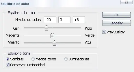 Ahora pinchamos el equilibrio de sombras y deslizamos el cian -20 y el azul +8.