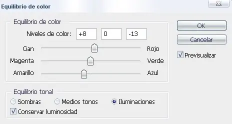 Finalmente pinchamos el equilibrio iluminaciones y deslizamos el rojo +8 y el amarillo -13.