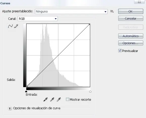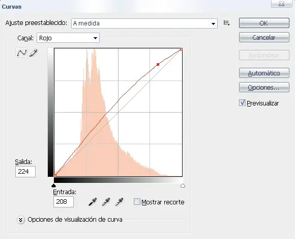 En el desplegable canales, pinchamos el canal rojo y damos la forma a la curva como en la imagen, la forma es una aproximación pudiéndose dar más o menos efecto.