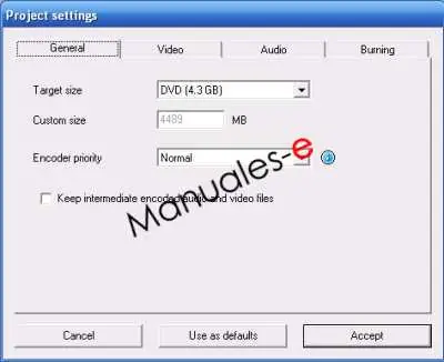 En la pestaña General ajustamos el tipo de proyecto, además de DVD podemos usar el programa para crear VCD o DVD de doble capa, igualmente podemos poner un tamaño personalizado al proyecto. En Encoder priority seleccionamos la prioridad para la compresión, es preferible no hacer ninguna cosa con el ordenador mientras se crea el DVD.