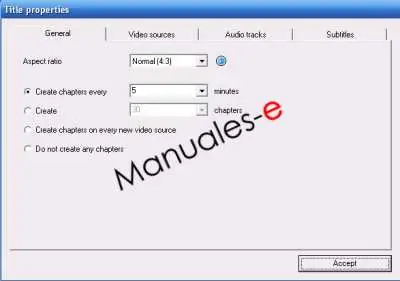 En la primera pestaña, General, podemos ajustar el aspecto que tendrá que la película y crear los capítulos para esta película. Si hemos añadido más de un vídeo podemos crear capítulos para cada uno de los vídeos añadidos. También podemos no añadir capítulos marcando la última casilla
