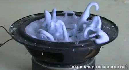 El sonido es una vibración, que se transmite a través de las sustancias como un cambio de presión a altas velocidades. Este cambio repentino de presión induce también esfuerzos dentro de nuestro fluido no newtoniano, por lo que su viscosidad aumenta y termina comportándose como un sólidos que realiza esos movimientos extraños. Nótese como se vuelve líquido nuevamente al cesar la vibración del altavoz.
