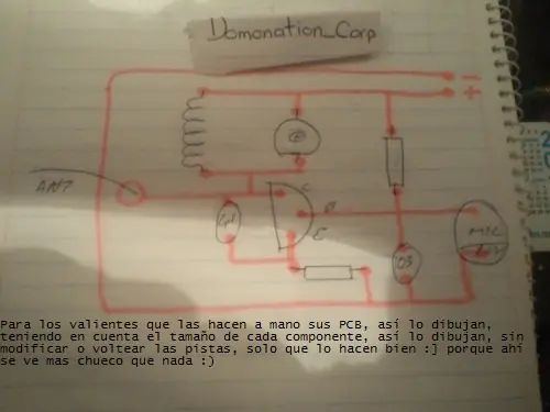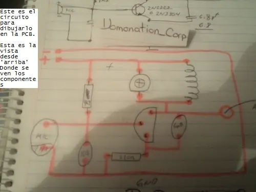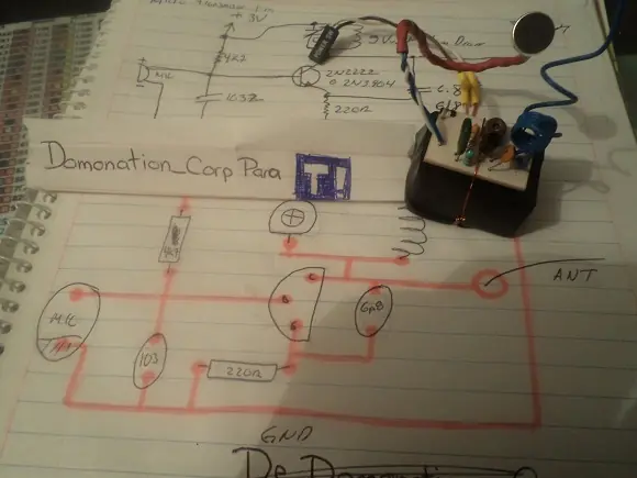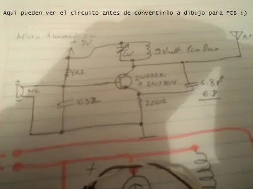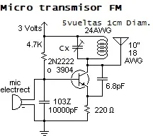 El circuito es de lo mas facil, un solo transistor, unas cuantas resistencias y unos cuantos capacitores, una bobina, un microfono, y algo dificil: un trimmer o capacitor variable.