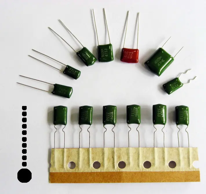 1 condensador de 0.01uF denominación: 103J, Z, M etc. Poliéster.