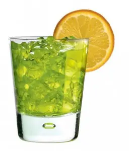 Agitar el contenido por espacio de unos 20 segundos hasta asegurarnos que tenemos una mezcla ideal y luego servir colocando un sorbete y adornando con una rodaja de naranja.