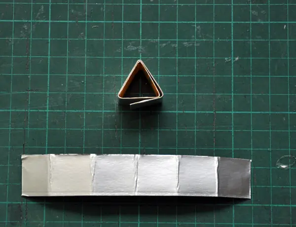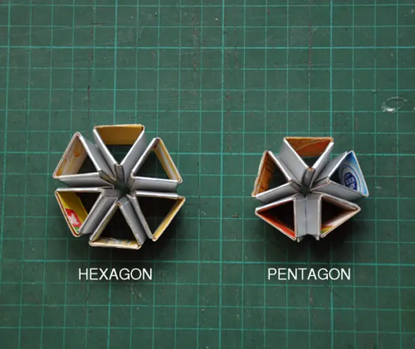 ya que tenga seis (6) triangulitos, formaremos las figuras complejas, que pueden ser exagonos o pentagones, a su gusto, y estas deberan ser unidas por medio de pegamento por la orilla interior, para que pueda hacerse el efecto de curva. si pegamos los 2 extremos, nos quedara una pared recta.