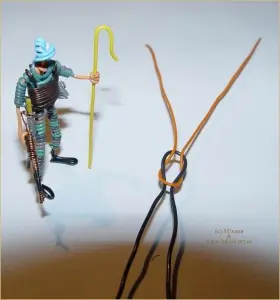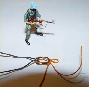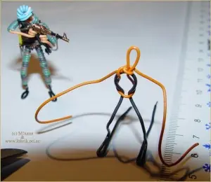 Luego , con uno de los extremos del cable naranja, haremos un lazo, que sera la "cabeza" del soldado y lo rodeamos con el otro extremo del mismo cable