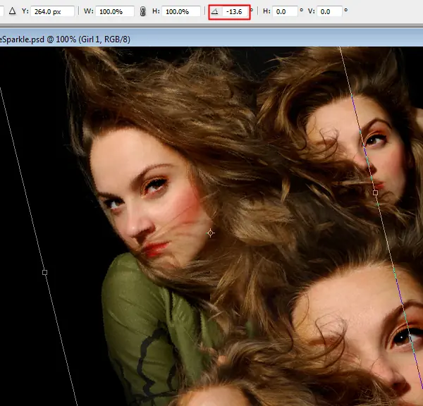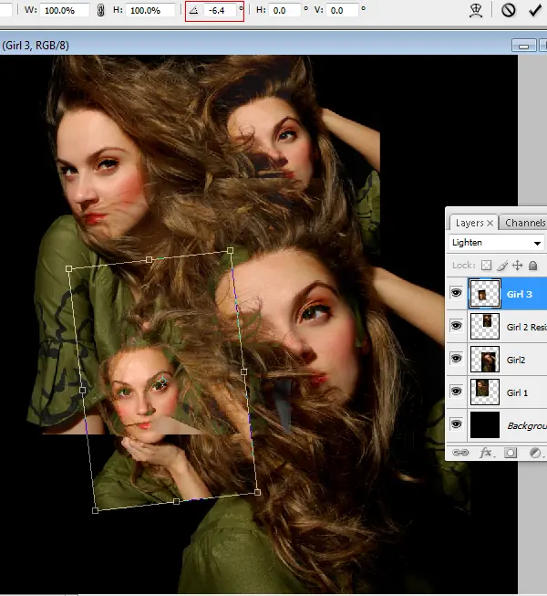 Paso 7Seleccione "Chica 3" y pulse CMD + T. A continuación, cambiar el ángulo de la imagen a -6,4. Una vez que haya terminado, mueva la "Chica 2" de unos pocos píxeles a la izquierda por lo que es más cercano a todas las otras imágenes.