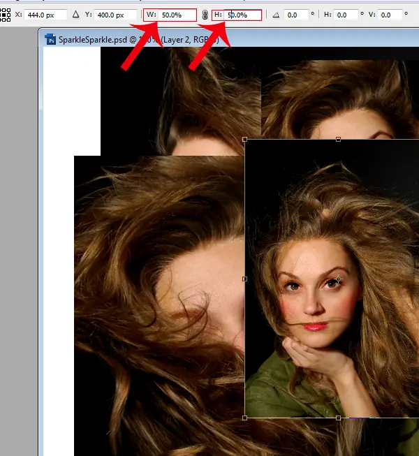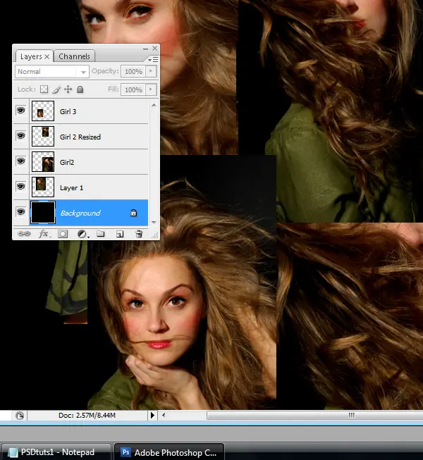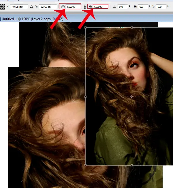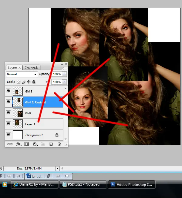 Paso 2Ahora tome Girl 2 y colocarlo en el documento. Vamos a utilizar esta imagen dos veces para la prensa CMD + J para duplicar. Pulse Comando + T en el más reciente de la imagen y cambiar el tamaño a 60% de eso.Cambiar el nombre de la imagen de tamaño regular "Girl2" y cambiar el tamaño de la nueva imagen (la que acaba de reducir a 60%) a "Chica 2 Reducido".