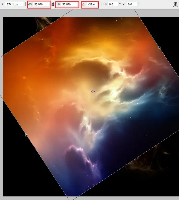 Paso 16Ahora que la base de la mezcla está terminada, ahora podemos empezar a añadir texturas a la misma.Ahora, en estos pasos que usted puede hacer máscaras y borrar de esa manera, pero yo sólo voy a seguir adelante y borrar con la herramienta goma de borrar. Tome este Moonchilde Ries Nebulosa y colocarla en el documento. Pulse Comando + T y cambiar el tamaño de la imagen al 50% y girar a -33,0.