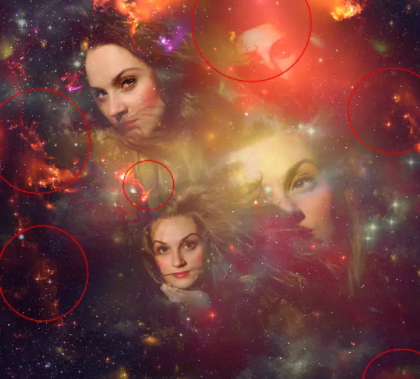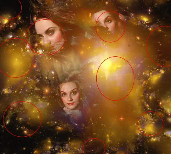 Paso 17Establezca esta capa nebulosa de Aligerar, y luego con un cepillo de dureza 200px 0% todo el año (en su defecto) de distancia borrar las áreas resaltadas en rojo.