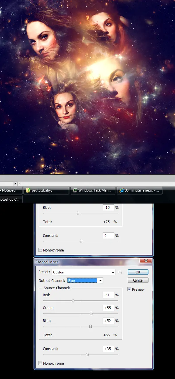 Paso 26Cerca de hecho (lo digo de verdad esta vez!) Ir a Capa> Nueva capa de ajuste> Mezclador de canales.Coinciden con la configuración de la mía, y luego una vez que haya terminado cambiar esta capa de ajuste de superposición del 41%.