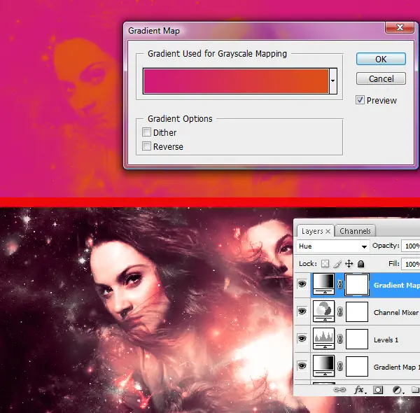 Paso 25Casi no! Ahora vamos a añadir una combinación de colores agradables a esto. Me gusta usar los mapas de degradado, ya que son buenos para eso. Ir a Capa> Nueva capa de ajuste de Mapa> degradado. Crear un gradiente que va de colores d11c72 # a # dd4e1a. Una vez que hayas terminado de cambiar esta capa de ajuste de tono.