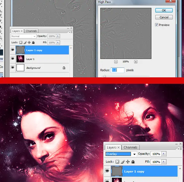 Paso 28Para mejorar aún más su imagen (este paso es opcional) puede aplanar la imagen, duplicar la capa (CMD + J) y luego ir a Filtro> Otros> Paso alto. Ajuste el Paso Alto en 1,2 (se puede jugar con este número) ya continuación, establezca que la capa de superposición y debe ser muy bien afilada