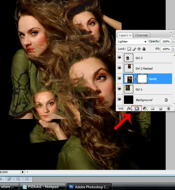Paso 8Ahora comenzaremos la base de esta gráfica de mezcla. Usted puede mezclar en una variedad de maneras, pero la mejor manera de hacerlo es usar máscaras. De esta manera, si usted comete un error o se siente la necesidad de cambiar algo en la imagen, es fácil hacerlo. Desde que utilizamos aclarar, que es un poco más fácil de mezclar, porque podemos ver que todo viene junto, pero tenemos que perfeccionar algunas cosas. Así que adelante y hacer una primera máscara sobre el tema "Chica 2" haciendo clic en el botón Máscara vectorial en la parte inferior de la paleta de capas.