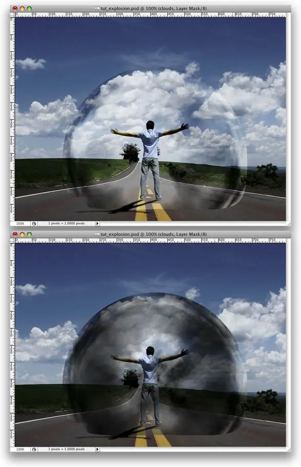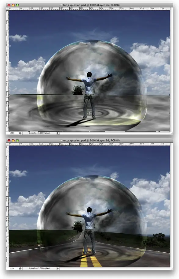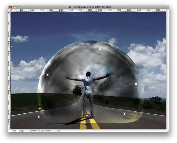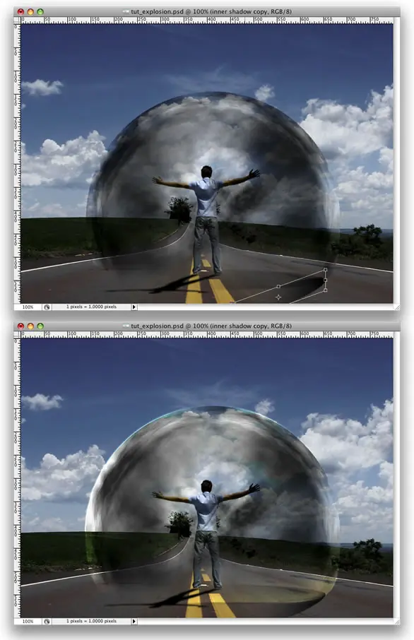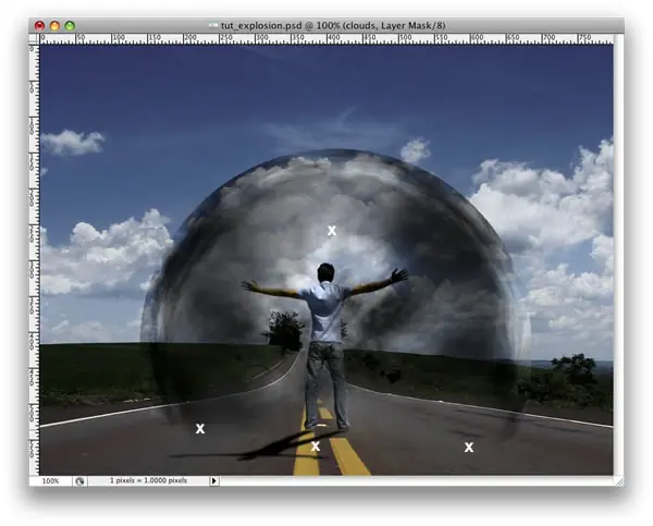Paso 18Ahora ir a Edición> Transformar> Distorsionar. Deformar la capa hasta obtener la perspectiva correcta.Después de eso, cambia el modo de fusión de superposición. Una vez más, como estamos usando nubes de procesamiento, los resultados pueden variar por lo que podría tener que borrar algunas partes para hacerlo más realista.